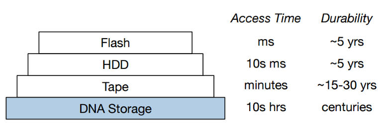 The genetic material is extremely durable in time, since for example intact DNA sequences have been identicated even in dinosaur remains, who lived 28,000 years ago. Also, despite the small size of the DNA sequences, they can ‘pack’ huge amounts of information. Something which, according to Bioscience, means that no more than 20 grams of genetic material would be needed to store all the digital information currently available.