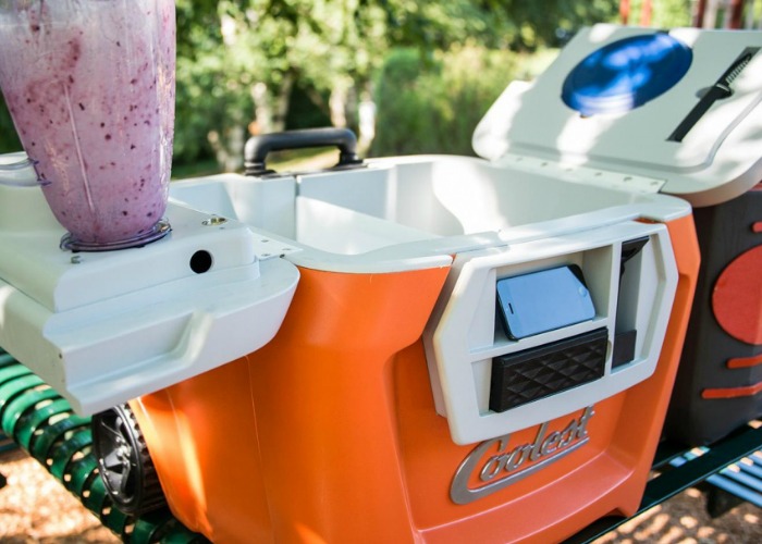 Cool right? The purpose of this project was to offer a fresh redesign of the classic cooler you take with you on your trips. It offers a built in blender, a USB port for charging and it even plays music from any smartphone that is wirelessly connected with.